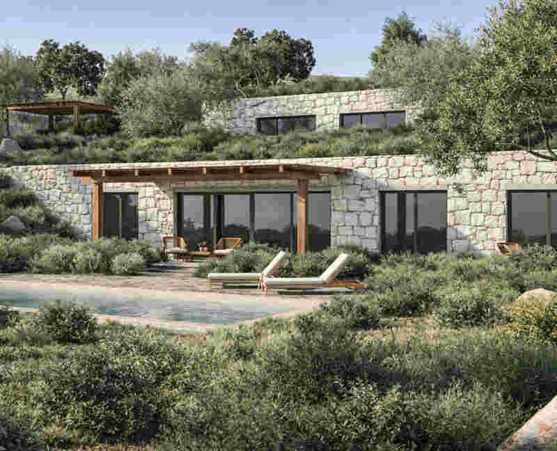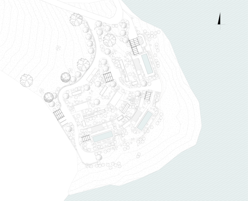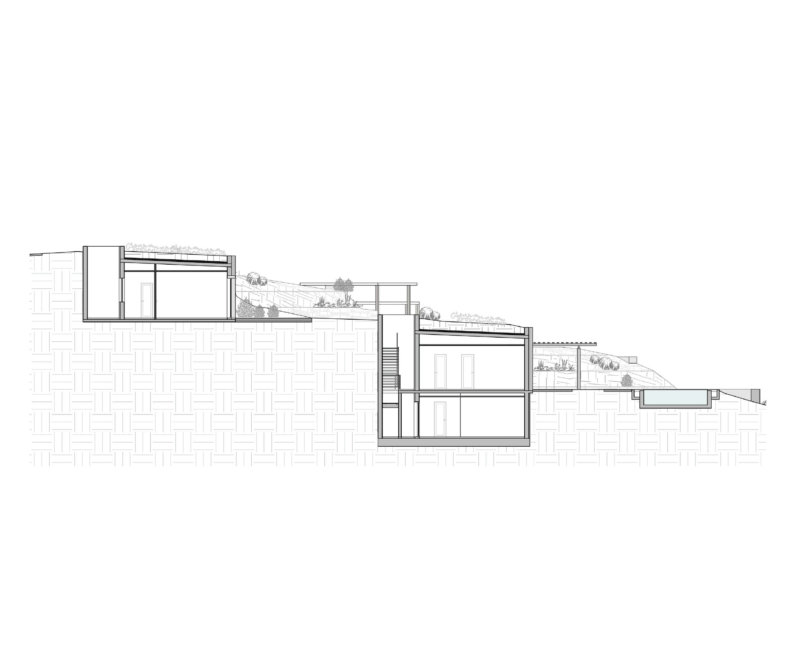Because the buildings are primarily perceived from the sea, their exposed façades are treated as retaining structures, built with local white stone and integrated vegetation. Access to the three villas is organized through a discreet internal passage, followed by a gradual descent into each house. The main objective is to recover and preserve the natural terrain, introducing only the necessary paths and connections between inhabited spaces.